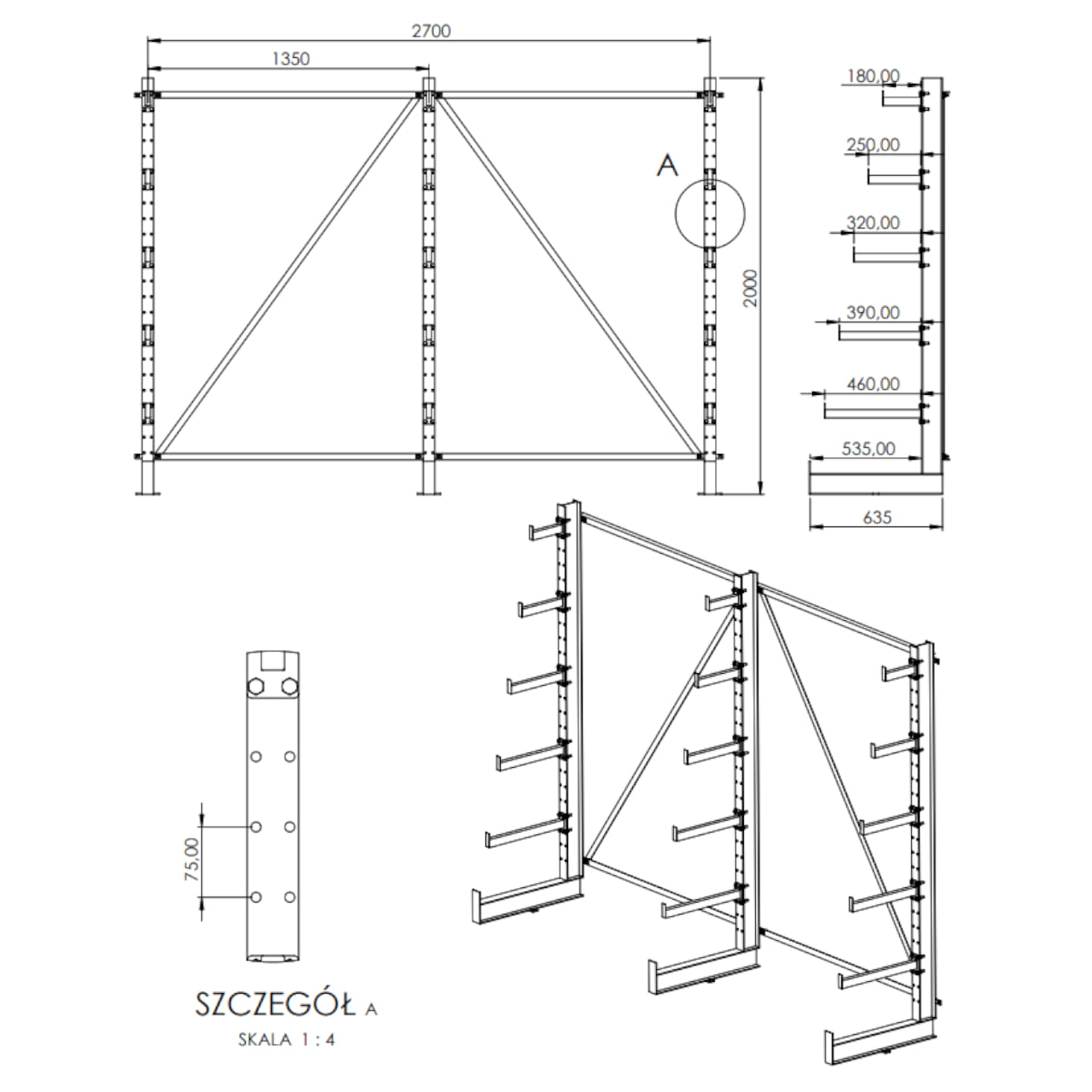 Regulowany spawany regał wspornikowy - choinkowy, jednostronny, 2000x2700x635mm
