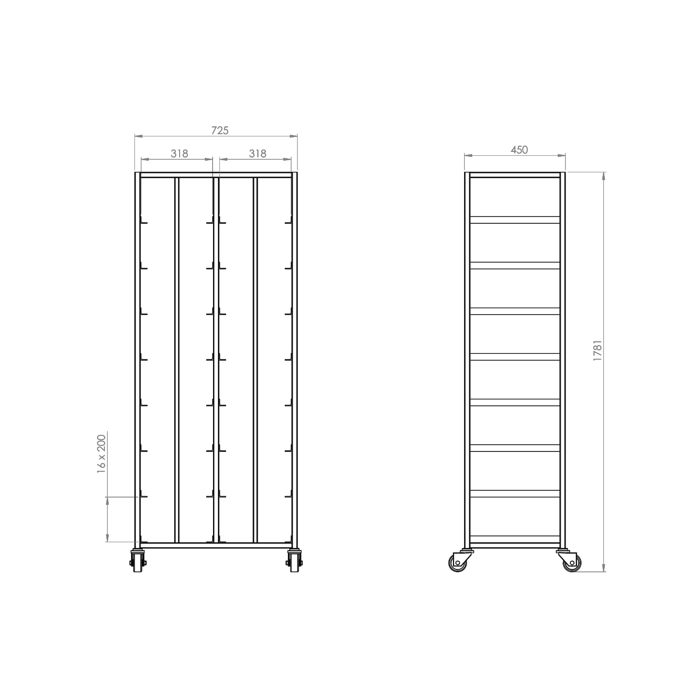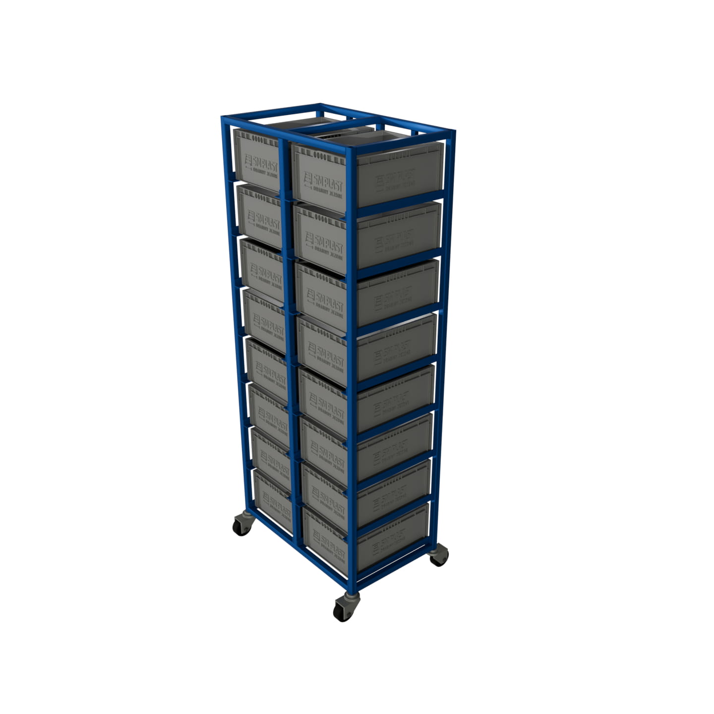 Praktyczny dwurzędowy wózek magazynowy przeznaczony do transportu i przechowywania skrzynek plastikowych. Wyposażony w 8 poziomów prowadnic, umożliwia szybki dostęp do pojemników i optymalizuje organizację pracy w magazynach, halach produkcyjnych i centrach logistycznych. Wykonany ze stalowych profili, malowanych proszkowo na kolor RAL 5017 – niebieski, charakteryzuje się wysoką trwałością i odpornością na uszkodzenia. Mobilność zapewniają 4 koła obrotowe, w tym 2 wyposażone w skuteczny hamulec.